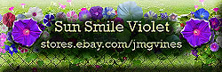 | Varieties Available | Ipomoea Nil | Creepers & Dwarves |There are few “creeping” morning glories. The Sun Smile series includes the four basic creeping morning glories, but there are more out there. Sun Smile Violet is a very deep purple, with a nice white picotee edge. If properly nourished, the Sun Smile morning glory can vine up to 6 to 8 feet. It can also be grown in hanging baskets with just a little trimming to keep it maintained. The colors of the Sun Smile series are very vivid and can always bring a smile.